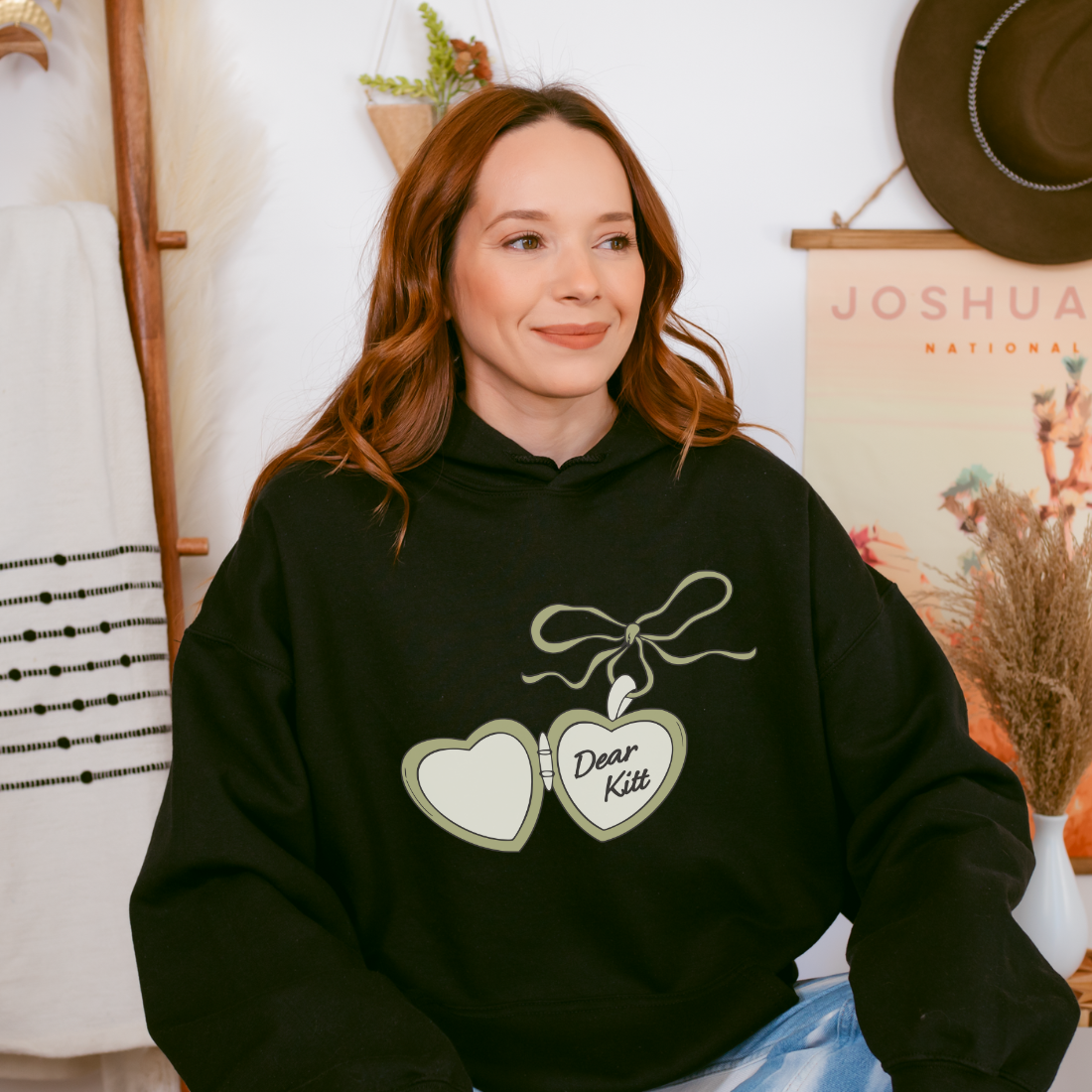 A story of love and secrets, made to be worn. This comfortable hoodie is adorned with a charming locket design, a nod to the heartfelt letters exchanged in Divine Rivals. The "Dear Kitt" salutation is a quiet, intimate detail that fellow fans will instantly recognize and adore. It’s the perfect piece for carrying the magic of Iris and Roman’s story with you, keeping their connection a cherished secret.