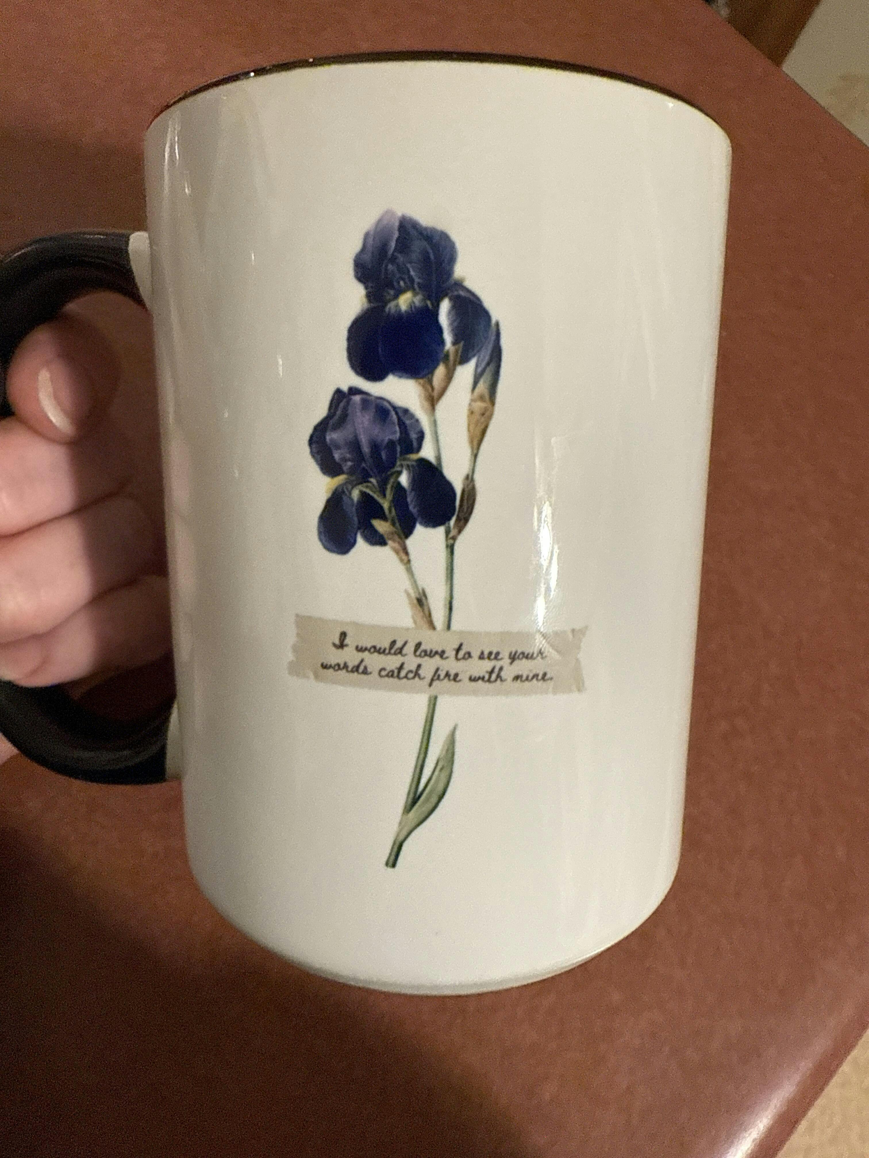 What better way to start a day of reading or writing than with a mug that celebrates the power of words? Inspired by Divine Rivals, this ceramic mug features a beautiful blue iris and the deeply romantic quote, "I would love to see your words catch fire with mine." It’s a perfect reminder of the magic that flows between two people through letters, whether by hand or by a mystical typewriter. Let every sip of your favorite beverage inspire your own words to take flight. This enchanting mug is the perfect gift for the writer, reader, or romantic in your life.