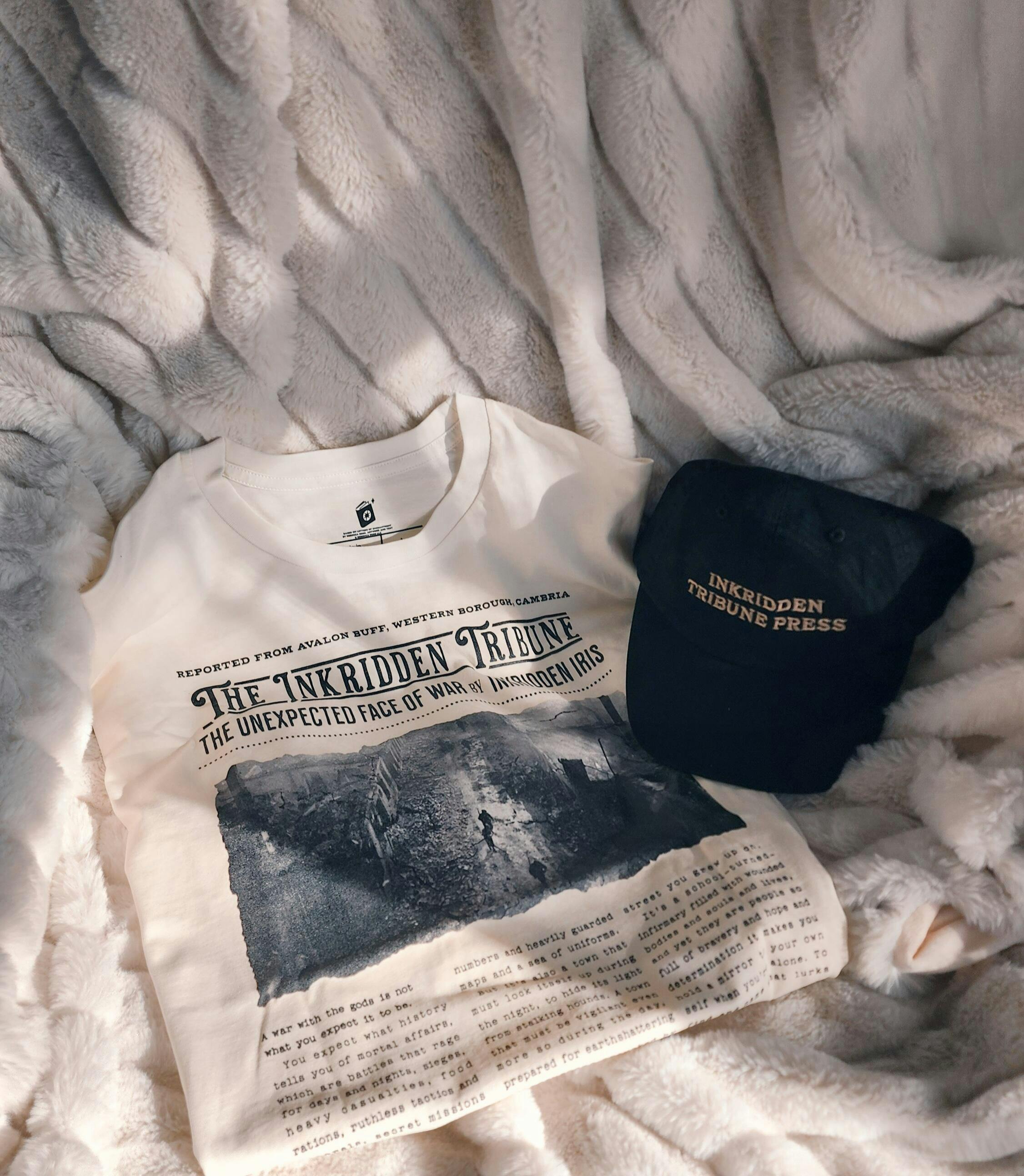Wear the story straight from the front lines. This T-shirt features a full-page article from The Inkridden Tribune, penned by the one and only "Inkridden Iris" herself. With its vintage newspaper layout, haunting imagery from Avalon Bluff, and Iris's powerful words on "The Unexpected Face of War" this design is a wearable piece of the Divine Rivals world. It’s a tribute to the courage of war correspondents and the profound, heartbreaking truths they uncover. For fans who want to hold a piece of the story, this shirt is an absolute essential. Get this unique piece of literary history today.
