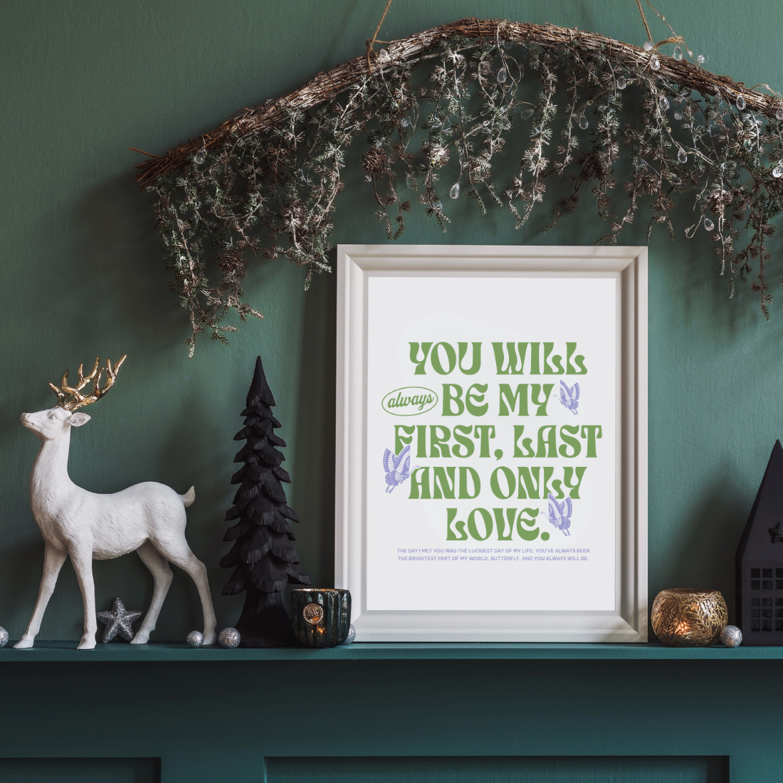 Bring the butterflies to your walls. This art print features the iconic Christian Harper quote, "You will always be my first, last and only love," designed with groovy text and butterfly accents. It’s a stylish, romantic addition to any bedroom or library, celebrating the epic conclusion of the Twisted series by Ana Huang. Decorate your space with love—buy now!